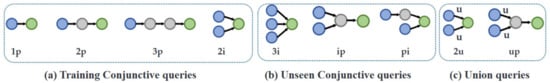- Hamilton, W.; Bajaj, P.; Zitnik, M.; Jurafsky, D.; Leskovec, J. Embedding logical queries on knowledge graphs. In NeurIPS; Curran Associates Inc.: Red Hook, NY, USA, 2018; pp. 2030–2041. [Google Scholar]