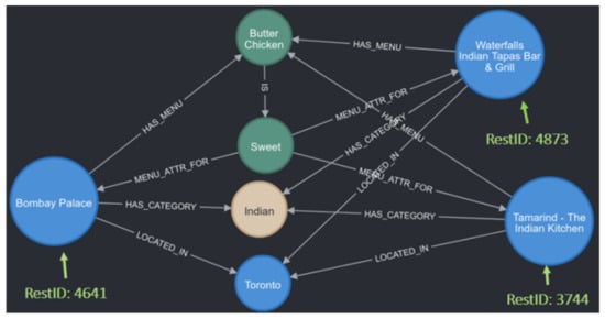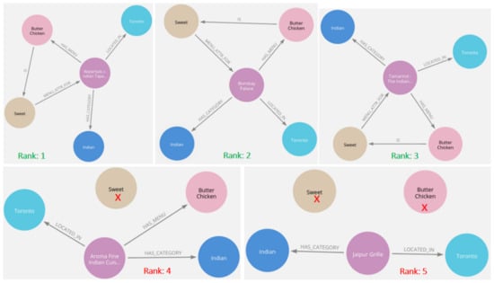 The cypher query approach produces actual candidates from the domain KG. It cannot recommend candidates if no match is found. However, Q2B aims to recommend the item, not to perform a search from the database. Therefore, it produces top-K, the semantically similar and closest candidates for each query triple. Hence, it can recommend items, even if there is no match found in the KG. Table 6 depicts the Q2B results for the input Query (1). The resultant restaurant candidates in bold (Rank 1, 2, and 3) are the actual restaurants that satisfy the result for input Query (1) from the stored KG, as shown in Figure 10. The candidate restaurants with Ranks 4 and 5, on the other hand, missed some entities or relationships to match exact candidates based on the given query. However, because the recommender system’s task is to recommend the top-K candidates, we consider the top five results, based on the semantic and contextual similarity of the query and KG. Additionally, this approach of producing candidates enables the generation of explainable findings. We define explainability, in terms of KG paths, for recommended candidates.