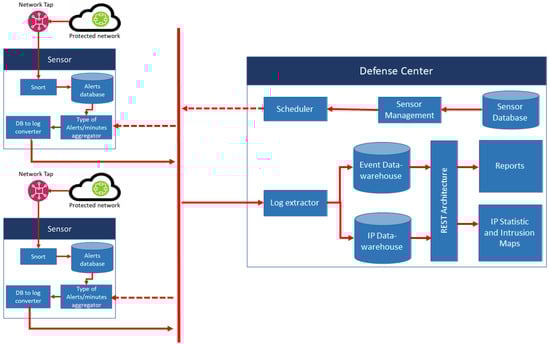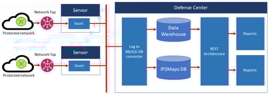 One of the best examples of Snort’s implementation is in the Mata Garuda Project of the Indonesia Security Incident Response Team in the Internet Infrastructure coordination center (ID-SIRTII/CC) [2,3]. We implemented the system on 12 ISP routers that handled the highest volumes of Indonesian Internet traffic in 2014. The intrusion detection, data aggregation sensors, and defense center were in the same networks. Each of the sensors had two interfaces: one for sniffing the packet and the other for sending the intrusion logs to the defense center each minute through a secure file transfer protocol (FTP). At the defense center, the data were aggregated based on various time units and enriched with IP geolocation to build attack maps and other security-related tools for analyses. Figure 1 shows the topology of Mata Garuda implemented at the ID-SIRTII/CC.