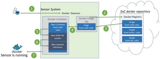 Moreover, Docker can shorten application development, testing, and production times. These advantages led us to base our Snort-based IDS sensor on docker technology [18]. We saw that we could build the Snort-based NIDS and its dependencies into one docker image. Users can download this pre-configured sensor application without any further configuration; this can be as simple as issuing the Command-Line Interface (CLI) “docker run” (see Figure 7). The sequence of installing and configuring the Snort sensor container is as follows: