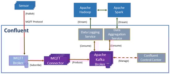 In the first stage of collecting data, the Kafka Broker does not directly receive the MQTT package when the package arrives at the machine that collects data blocks. We used Confluent’s Kafka-connect feature in the MQTT server and created a bridge class connector to bridge the MQTT server to the Kafka Broker. We chose the Confluent platform because of the simplicity with which it performs transformation tasks such as encoding, encrypting, and transforming data before the data go to any Kafka Broker partitions. We transformed the data into the Avro format (an encoded binary format) because Avro-format data have a higher level of security than JSON or ordinary text files. We had to define the Avro schema to read and parse the data at the receiver.