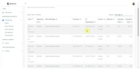 Users can access all of the information sent by the sensors that the defense center has processed through a web browser using their previously set username and password. The information available on the dashboard page includes the sensor statistics; the daily, weekly, and monthly attack data; and a page for sensor management. We used [21,22] to design our dashboards, and Figure 9 shows examples of our dashboards. We provided two main menus on the left side: (1) Monitoring & Statistics and (2) Report & Summary. The IDS metrics that we used are as follows: