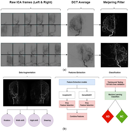 The previous studies have not addressed the use of all types of neuroimaging for the diagnosis of Alzheimer’s disease. Some of the most unused neuroimaging data are from DSA scans, which are a catheter cerebral angiography used to reveal accurate anatomical information for cerebral blood vessels and are considered a good indicator to diagnose and monitor Alzheimer’s disease conditions [48]. DSA is the golden standard to diagnose and build a treatment plan for patients who are suffering from vascular anomaly, because of its high-resolution anatomical data about the cerebral blood vessels, besides the ability to analyze the blood flow in real-time [49]. Therefore, it is possible to use DSA data in the early detection and diagnosis of Alzheimer’s disease because it carries strong indicators that are characterized by very high accuracy, sensitivity, and specificity.