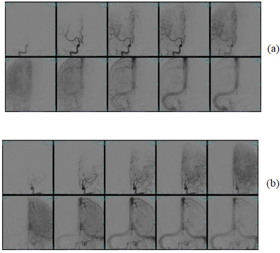 Sample of DSA scans: (a) selective right internal carotid artery, and (b) selective left internal carotid artery.