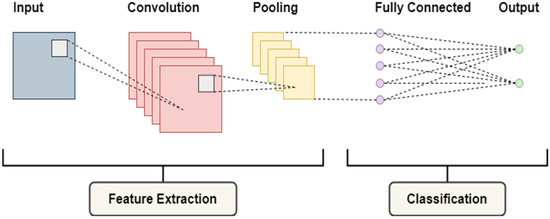 CNN is a kind of feedforward artificial neural network that is popularly used for image recognition purposes. It can operate directly on raw input such as pixels, which effectively automates feature selection [75]. A general model of CNN consists of four components, namely, input layer, convolution layer, pooling layer, fully connected layer, and output layer. Figure 5 shows the basic architecture of a CNN model that performs two main tasks, which are feature extraction and classification.
