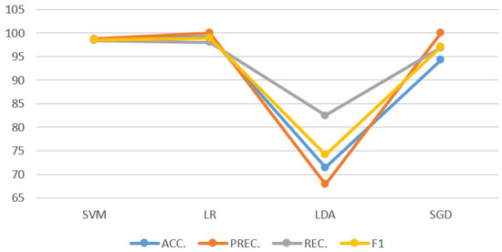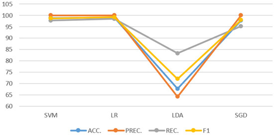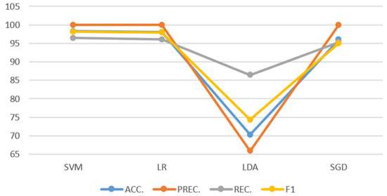 Then, the appropriate metrics were calculated [79], which are accuracy, precision, recall, and F1-score represented by Equations (4)–(7), respectively, for further comparison between classifiers’ performance.