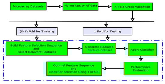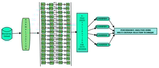 The proposed model, which is shown in Figure 1, presents the high-level overall workflow that contains the highly spaced microarray database. It is scaled or normalized and validated with k-fold cross validation having (k − 1) fold for training and 1 fold for testing. After validating the data properly, then it is passed through a block, where the proposed sequence of the feature ranking process with different classification is performed in a proper manner. That block of the proposed model is described briefly, as shown in the Figure 2 where sixteen feature reduction (FR) sequences are designed from the four feature ranking techniques known as reduction combinations (RC) i.e. RC1–RC16. For the sequencing of feature ranking, four ranking techniques are taken into consideration, which are in order and represented as follows: FR1: Pearson Correlation Coefficient-Based Feature Selection, FR2: Chi-Square Test, FR3: Information Gain, and FR4: Relief Method. In every stage of reduction, 80% lower-ranked genes are dropped, and thus, the reduced dataset at different levels are formulated. It is very difficult to evaluate which ranking technique works well on a dataset for a specific classifier. Hence, to design the most superior RC for highly spaced gene expression data, a multi-criteria-based decision-making technique was applied in which TOPSIS is implemented considering Accuracy, Specificity, Sensitivity, Jaccard, and Gmean as five evaluation techniques. The proposed model is presented in Figure 1 in two ways, where Figure 1 explains the high-level overall flow and shows the overall model design, and Figure 2 explains the details of proposed work with the Multi-Attribute Decision-Making (MADM) process for obtaining a better sequence and classifier combination.