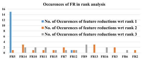 Before going to feature sequencing, first, datasets are normalized by min–max normalization, the values are converted to between 0 and 1 for each feature. After that, feature sets are reduced by 20% in each of the four steps adopted in the sequence. Further simulation is conducted to come up with an optimal set of features, fixing it within the number of 10. Then, the reduced feature sequences are validated by the 10-fold cross-validation approach by separating the training and testing data with respect to the considered classifiers; the classification outputs are presented in Table 3 and Table 4. As a result of analyzing Table 3 and Table 4, it is clear that none of the classifiers obtain the optimal results across all metrics, and the ranking of the top-performing model differs depending on the performance assessment measurement chosen. Hence, further analysis of classifiers and the FR sequencing approaches is performed by TOPSIS. Table 5 represents the result of the TOPSIS approach implemented on the Brain Tumor dataset, where rows are representing 16 number feature reduction sequences from FR1 to FR16 and columns are representing classifiers used such as k-NN, LR, DT, and RF with five performance criteria: accuracy (CR1), sensitivity (CR2), specificity (CR3), jaccard (CR4), and gmean (CR5). The classification result on each dataset is given in Table 2 and converted to the corresponding weighted normalized matrix by using Equation (15) for each dataset, as shown in Table 5, Table 6, Table 7 and Table 8. Then, the ideal best value is chosen from the set of combinations of best performance values for each dataset individually, and the ideal worst value can also be chosen from the set of worst performance values, as given in Equations (14) and (15). The Ideal Best and Ideal Worst solution separation measure or Euclidean distance can be measured by using Equations (16) and (17), whose results are shown on the column as and individually for each dataset in Table 5, Table 6, Table 7 and Table 8. Finally, the ideal solution performance score can be found out by using Equation (18), which is represented as for ranking of each feature reduction sequences individually with referencing to the datasets shown in Table 5, Table 6, Table 7 and Table 8. As described above, Table 6, Table 7 and Table 8 represent the TOPSIS result analysis for the Colon Cancer, Breast Cancer, and Adenoma Cancer datasets. After obtaining the ranks of each FR, the performances of all FR are compared in Table 9, where the top three ranked feature reduction sequences with respect to all classifiers are taken into consideration. As it is difficult to choose which sequence performs better, the occurrence of the few top-ranking FR is also calculated in Table 10, from which it is observed that FR5 is superior. FR5 is coming in first rank expect for one classifier (i.e., LR), where the rank is second. Finally, in Figure 3, the number of occurrences of all FR coming in the top three ranking is shown. Here, it is also found that out of 48 occurrences (as in Table 9), FR5 is coming under the top three rank in 16 occurrences. However, for other FR cases, the occurrence is quite nominal. Hence, it can be said that the FR5 model can work better as the feature reduction sequence given for four datasets, as shown in Figure 4.