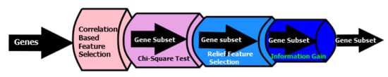 A rank-based approach is one of the dominant feature selection approaches in high-dimensional data analysis. This approach awards a rank based on one mathematical score to all the features in the original data. Top-ranked features are assumed to be highly informative, and a few of them are selected in the descending order of their rank. Each ranking algorithm is unique, which focuses on the score based on the ranking criteria. However, feature selection based on a single ranking criterion for any dataset may not result in satisfactory prediction. Hence, different ranking techniques are assigned to various gene-based sequencing datasets on this ranking technique’s-based feature evaluation scheme [20]. As a result, the informative gene sequence in one approach may not be the same in another. Thus, a filter technique that is useful in some problem spaces may not be successful for all datasets that refer to different applications. Hence, one ranking technique may outperform others for a specific type of problem. Thus, in this study, in place of extraction of a few top-ranked features using a single ranked-based filter technique, the merits of sequencing various filter techniques are considered. Furthermore, these genes are passed through a sequence of filter ranking approaches. In every stage of filtration, few highly ranked features are taken to the next level, and the rest are dropped.