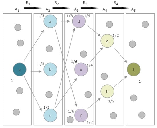 The above definition uses the multiplication of transition matrices to obtain reachable probability matrices, which in turn give the HeteSim score with respect to a given metapath. We can recast this matrix multiplication in the language of random walks. Consider the example graph and metapath given in Figure 1. Beginning with node s, we assign the probability value 1, since this is the specified source node. Next, we distribute that probability among all neighbors of s with type A 2 joined by an edge of type R 1 . These neighbors are a , b and c, and each of these three nodes gets labeled with the probability 1 / 3 . We repeat the same process with the neighbors of a , b , c having type A 3 and joined by an edge of type R 2 . The probability 1 / 3 assigned to node a is split between its neighbors d and f, with each neighbor receiving 1 / 6 . Node b has no eligible neighbors, and so its probability mass does not propagate to the next layer of the graph. Node c splits its probability mass of 1 / 3 between d and e. Therefore, d is labeled with probability mass 1 / 3 , with  1 / 6 coming from a and 1 / 6 from c. Node e only receives probability mass from c and is therefore labeled with 1 / 6 . Similarly, node f receives probability mass only from a, and therefore has total probability mass 1 / 6 . This computation, which is equivalent to the matrix multiplication described above, gives