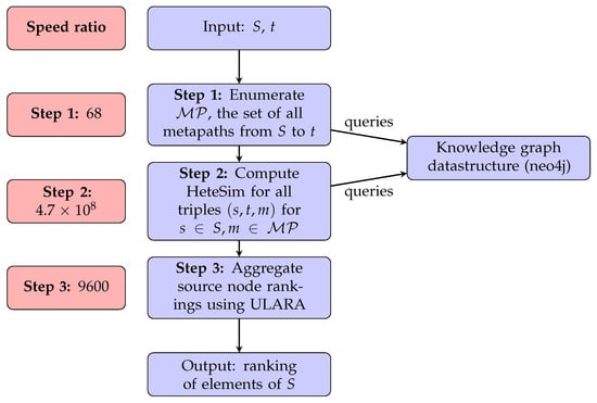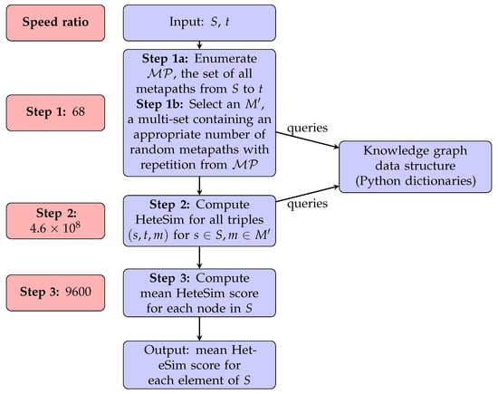 Figure 5. Overview of SemNet version 2 approximate mean HeteSim implementation. Speed ratio is ( SemNet 1 time ) / ( SemNet 2 time ) and is given for source node insulin and target node Alzheimer’s disease. SemNet version 2 used approximation parameters ϵ = 0.1 and r = 0.9 .