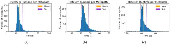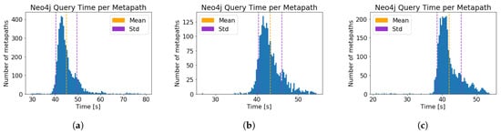 Figure 4. Distribution of Neo4j query times in SemNet version 1 HeteSim computation for all metapaths joining the given source node and Alzheimer’s disease. (a) Insulin; (b) Hypothyroidism; (c) Amyloid.