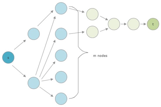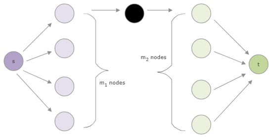 Figure 6. An example knowledge graph. Here, we use the convention that nodes are organized by type into vertical columns in the order that they appear in the metapath. We also only show edges that may appear in some metapath instance. This example has m 1 1 dead-end nodes on the left and m 2 1 dead-end nodes on the right. The HeteSim score of s and t with respect to the metapath is 1 for all values of m 1 and m 2 .