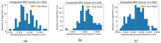 Figure 8. Computed randomized pruned HeteSim (RPH) scores for each of the three test graphs. (a) Test graph 1; (b) Test graph 2; (c) Test graph 3.