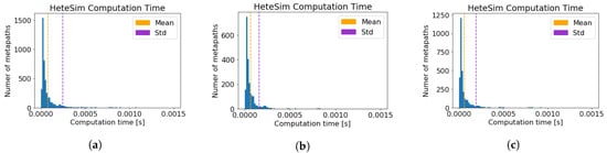 Figure 3. Distribution of SemNet version 1 HeteSim computation times for all metapaths joining the given source node and Alzheimer’s disease. (a) Insulin; (b) Hypothyroidism; (c) Amyloid.