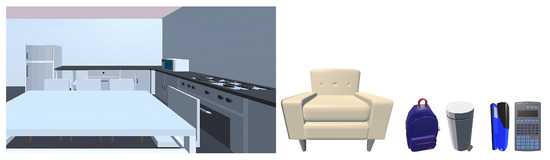 The created 3D home environment with exemplary corresponding objects, one from the large size and two from the medium size and two from the small size groups, chosen based on prestudy survey results.