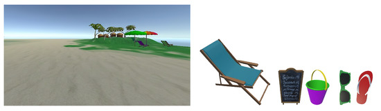 The created 3D beach environment with exemplary corresponding objects, one from the large size, two from the medium size, and two from the small size groups, chosen based on prestudy survey results.