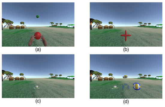 Steps in the execution of the object recognition task. (a) First, a red ball appeared until the participant centered their view and pressed the joystick button. (b) The fixation cross appeared for two seconds. (c) An object appeared at the location indicated by the fixation cross. (d) Finally, three objects appeared, and the participant was asked to quickly select the object that had just been displayed by using the controller’s joystick.