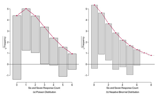 Rootogram functions showing the over and under dispersions of the “six and seven answer” counts from the SUS questionnaires. (a) shows the fit to a Poisson distribution; (b) shows the fit to a negative binomial distribution.