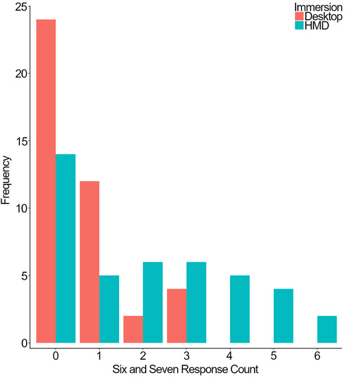 According to Hypothesis 1, which involves higher immersion, here, the HMD-based VR technology was expected to lead to increased feelings of presence. The collected presence questionnaire (SUS) responses were analyzed by fitting a Generalized Linear Model in R. Figure 4 shows rootogram outputs of the two compared models with regards to their AIC values. The model in Figure 4a used a Poisson distribution to fit data and had an AIC value of 305, while the model in Figure 4b fitted a negative binomial distribution and had an AIC value of 292. This indicates that the later model was preferable and was therefore select for further analyses. Figure 5 shows a bar chart of the raw data of the number of “six and seven” response counts in the six questions of the SUS questionnaire. The average count was 2.02 in desktop conditions and 3.30 under HMD conditions. It may be noted that there are no participants who rated 6 and 7 in more than three questions after experiencing the desktop display condition. The fixed effect of the display condition on the expression of strong presence feelings was significant in the negative binomial model ( = −0.81, SE = 0.24, p = 0.001).