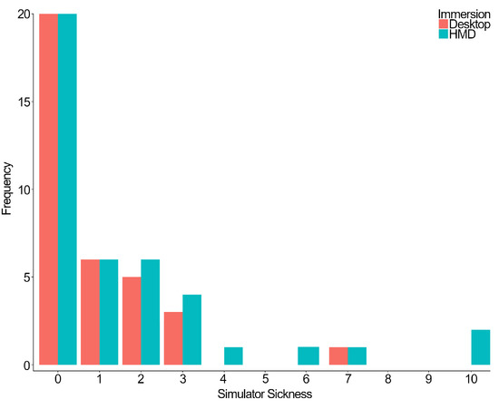 Figure 6 shows the collected answers about symptom severity in the fast motion sickness scale (FMS) while comparing the two immersion levels. The FMS has a response range from 0 (no sickness at all) to 20 (frank sickness); however, the maximum given answer was 10 (overall mean = 2.9, desktop = 2.6, and HMD = 3.1). Based on the statistical tests, by fitting a Generalized Linear Model with a gamma distribution, the fixed effect of display device ( = −0.15, SE = 0.05, p = 0.009) had a significant effect on the subjective reports of simulator sickness severity.