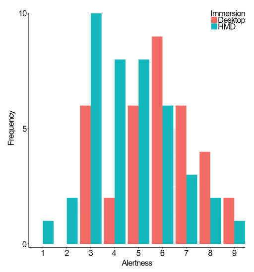 Additionally, the aim was also to see whether the subjective feeling of being present in the environment would be affected by the display device type used to present the virtual environment to the user. Slater et al. [1,35] translated more immersion as providing perceptual cues more in line with expectations from real world equivalent environments, which would be thought to lead to more presence in higher immersive setups [18,19,20,21]. In addition, it has been shown that the usage of virtual reality technologies can also lead to other effects, such as symptoms akin to motion sickness [36,37] that can affect behavior and evaluations of virtual reality users [38,39]. As such, it was also documented whether the display conditions differed in the severity of induced simulator sickness symptoms and in the alertness level of the participants.