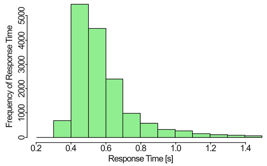Task performance was analyzed with generalized mixed-effects regression models. The distribution of response times was best described using a Gamma distribution (right skewed) with the shape parameter and the scale/rate parameter . In Figure 8, the distribution of response time data collected from all participants is reported by using a histogram (at a bin size of 0.1 s intervals). To evaluate the existence of congruency presence effects in response time data, the comparison of different Mixed-Effect models was used. The initial null model, which includes only a random global intercept for “participants”, was compared against the model including background environment and object category. The Chi-Square test between these models was significant, (2) = 27.56, p < 0.001. The AIC value of the null model was −17,431 and −17,455 for the later model. Adding the interaction effect of object category and environment type resulted in a model with an AIC value of −17,453. The model comparison to the model with only the related main effects did not reach significance, (2) = 0.00, p = 0.9762.
