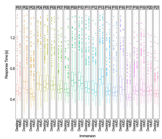 To evaluate the effects of the immersion level, Figure 9 shows the distribution of reaction times for each of the 21 participants by comparing HMD and desktop conditions using Box and Whisker diagrams.