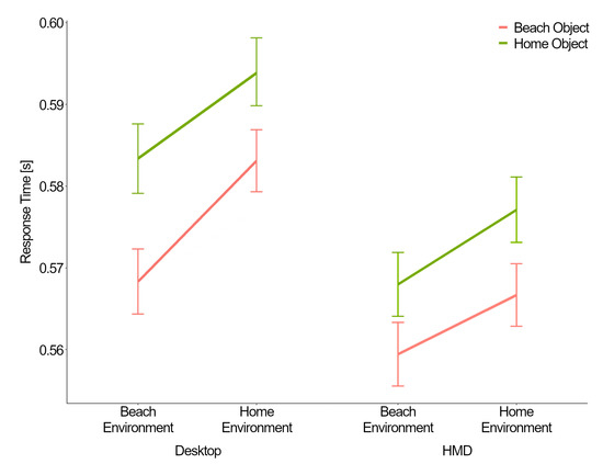 Three-way interaction effect between immersion level (Desktop/HMD), test object category (Beach/Home), and the environment type (Beach/Home) on response time.