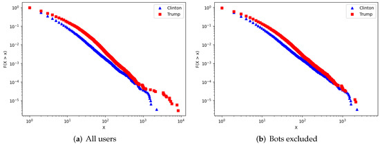 In order to extract the publishing behavior of social media users involved in the political discussion, we used the information about their political orientation coming from the user polarization step, computing a publishing model for each candidate. In particular, such models are represented by the complementary cumulative distribution function (CCDF) of the number of posts posted by users supporting Clinton and Trump respectively. Obtained results considering all accounts and excluding Bot accounts from them are shown in Figure 2. Specifically, for a given number of posts x the scatter plots show, in a log-log scale, the frequency of users publishing a number of posts greater than x (i.e., ).