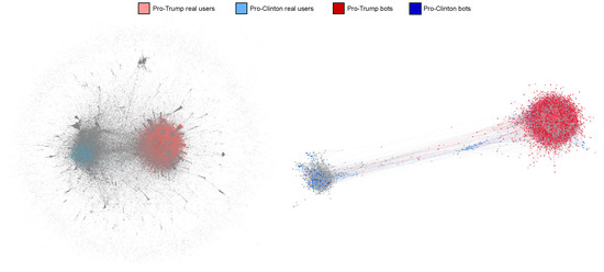 Figure 3 graphically summarizes the results obtained in this step. In particular, the entire G graph is plotted (left graph), coloring the different nodes according to their polarity and characteristics. In particular, the polarized bots belonging to pro-Trump and pro-Clinton seed-sets are colored in dark red and dark blue respectively, influenceable nodes assigned to Trump are represented in light red, those assigned to Clinton in light blue and neutral nodes in gray. Finally, in order to obtain a clearer view of the influenced nodes in the network, we reduced the initial graph by 90% while keeping the top-k nodes with highest degree (right graph). In this way we maintained almost unchanged the polarity-based clustering structure emerged in the total graph, achieving a neater representation of the results of the diffusion process.