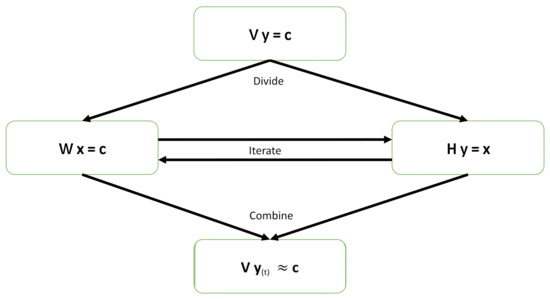 Generally speaking, given a vector (dependent variables), we are interested in the linear regression of (independent variables) onto for a better understanding of the relationship between the dependent and independent variables because many data processing techniques are based on solving a linear-regression problem, for example, beamforming (see [34]), model selection (see [35,36]), robust matrix completion (see [37]), data processing for big data (see [38]), and kernel-based learning (see [39]). Most importantly, the Wiener–Hopf equations are frequently invoked in optimal or adaptive filter design [40]. When tremendous “taps” or “states” are considered, the correlation matrix in the Wiener–Hopf equations becomes very large in dimension. Thus, solving Wiener–Hopf equations with large dimensions is mathematically equivalent to solving a big-data-related linear-regression problem. Because the factorization of a large, big-data-related matrix (or a large correlation matrix) can bring us advantages (as previously discussed), the main contribution of this work is to propose new iterative methods that can work on the factorized matrices instead of the original matrix. By taking such a matrix-factorization approach, one can enjoy the associated benefits in computation, implementation, and representation for solving a linear-regression problem. Our main idea is to utilize a couple of stochastic iterative algorithms for solving the factorized matrices by the Gauss–Seidel algorithm (GSA) in parallel and then combine the individual solutions to form the final approximate solution. There are many existing algorithms to solve large, linear systems of equations, however, the proposed GSA is easier to program and takes less time to compute each iteration compared to existing ones [41,42]. Moreover, we even provide parallel framework to accelerate the proposed GSA. Figure 1 presents a high-level illustration for the proposed new method. This approach can serve as a common framework for solving many large problems by use of the approximate solutions. In this information-technology boom era, problems are often quite large and have to be solved by digital computers subject to finite precision. The proposed new divide-and-iterate method can be applied extensively in data processing for big data. This new approach is different from the conventional divide-and-conquer scheme as there exist no horizontal (mutual iterations among subproblems) computations in the conventional divide-and-conquer approach. Under the same divide-and-iterate approach, this work uses GSA, instead of the Kaczmarz algorithm (KA) [43], to solve factorized subsystems in a parallel method.