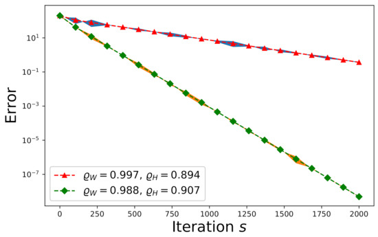 The run-time results listed by Table 1 and Table 2 are evaluated for different dimensions: k = and m = with respect to different n. The run-time unit is seconds. The computer specifications are as follows: GeForce RTX 3080 Laptop GPU, Windows 11 Home, 12th Gen Intel Core i9 processor, and SSD 8GB. Table 1 compares the run-times for the LU matrix factorization method in [51] and alternate least-squares (ALS) method in [52] with respect to different dimensions involved in the factorization step formulated by Equation (1). According to Table 1, the ALS method leads to a shorter run-time compared to the LU matrix factorization method. Table 2 compares the run times of the LAPACK solver [53], our proposed Gauss–Seidel algorithms with the factorization step formulated by Equation (1) (acronymed as “Fac. Inc.” in the tables), and our proposed Gauss–Seidel algorithms without the factorization step formulated by Equation (1) (acronymed as “Fac. Exc.” in the tables) for = and = . If = , the convergence speeds of our proposed Gauss–Seidel algorithms are slow since is close to one and thus it requires a longer time than the LAPACK solver. However, our proposed method can outperform the LAPACK solver when is small since our proposed Gauss–Seidel algorithms will converge to the solution much faster.