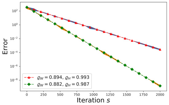 where and is a constant related to the matrices and . If the (error) tolerance of is predefined by , one has to go through the “while-loop” in Algorithm 1 for at least times. For each while-loop in Algorithm 1, we need arithmetic operations for updating and another arithmetic operations for updating using p processors. Therefore, given the error limit not exceeding , the time-complexity for solving a consistent system with can be bounded as: