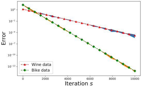 In addition to the Monte Carlo simulations shown in Section 6.1, we also validate our proposed new algorithms for real-world data on wine quality and bike rental. Here we use two real-world datasets from the UCI Machine Learning Repository [49]. The first set is related to wine quality, where we chose the data related to red wine only. The owner of this data set invoked twelve physicochemical and sensory variables to measure the wine quality. These variables include: 1—fixed acidity, 2—volatile acidity, 3—citric acid, 4—residual sugar, 5—chlorides, 6—free sulfur dioxide, 7—total sulfur dioxide, 8—density, 9—pH value, 10—sulphates, 11—alcohol, and 12—quality (each score ranging from 0 to 10). Consequently, these twelve categories of data can form an overdetermined matrix (as a matrix ) with size . If the nonnegative matrix factorization is applied to obtain the factorized matrices and for , we have and . The expected errors and the actual errors for wine data (denoted by triangle) are depicted in Figure 6, where Algorithm 2 is applied to solve the pertinent linear-regression problem in this case. On the other hand, another dataset about a bike-sharing system includes categorical and numerical data. Since the underlying problem is linear regression, we can work on the numerical attributes of the data only. These attributes include: 1—temperature, 2—feeling temperature, 3—humidity, 4—windspeed, 5—causal counts, 6—registered counts, and 7—total rental-bike counts. The matrix size for this dataset is thus , and the corresponding parameters to this matrix are , , and . The expected errors and the actual errors for bike data (denoted by rhombus) are delineated in Figure 6.