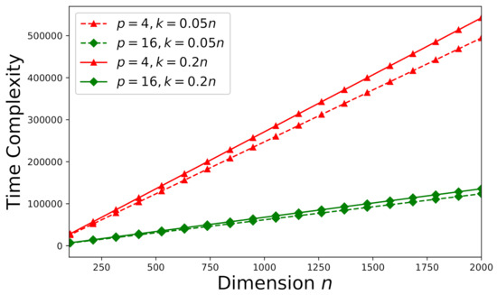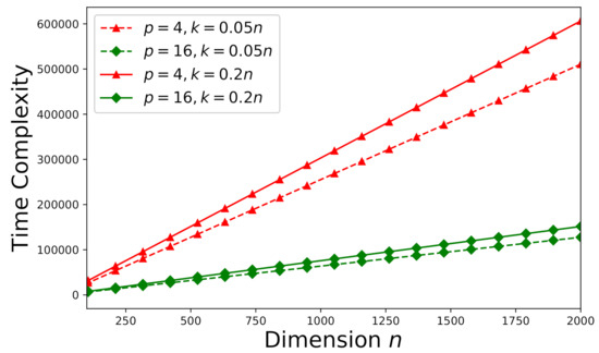 On the other hand, let’s focus on an arbitrary inconsistent system (an arbitrary Monte Carlo trial as stated in Section 6.1) now. The corresponding time-complexities for and are delineated by Figure 9. Note that one more vector is required to be updated in Algorithm 2 compared to Algorithm 1, the time-complexities shown in Figure 9 are higher that those shown in Figure 7 subject to the same . Because our derived error-estimate bound is tighter than that presented in [46] for the EGSA, the time-complexity of the proposed method for an inconsistent system has been reduced about 60% from that of the approach proposed by [46] subject to the same . How the number of processors p and the dimension k affect the time-complexity for inconsistent systems is illustrated by Figure 10 subject to the error tolerance .
