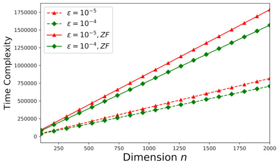 Time-complexity versus n for an arbitrary inconsistent system (, ). The curves denoted by “ZF” illustrate the theoretical time-complexity error-bounds for solving the original system involving the matrix without factorization (theoretical results from [46]).