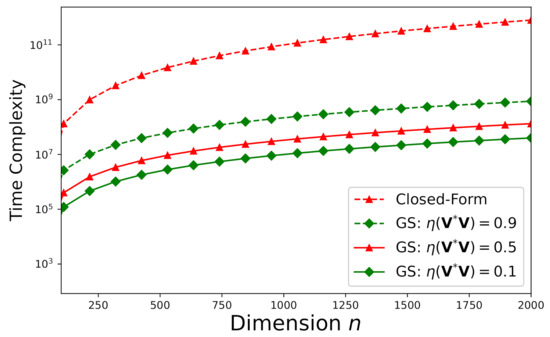 Figure 11 demonstrates that if < 1, our proposed new iterative Gauss–Seidel approach requires less time-complexity than the exact (closed-form) solution. According to Figure 11, the time-complexity advantage of our proposed approach becomes more significant as the dimension grows.