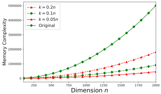 Memory-complexity is also investigated here according to the theoretical analysis stated in Section 5.2. Figure 12 depicts the required memory-complexity for solving an arbitrary consistent system (the same as the system used in Section 6.3) using Algorithm 1. The memory-complexity is evaluated for different dimensions: , , and . We further set . On the other hand, for an arbitrary inconsistent system (the same as the system used in Section 6.3), all of the aforementioned values of m, n, and k remain the same and Algorithm 2 should be applied instead. Figure 13 plots the required memory-complexity for solving an inconsistent system using Algorithm 2. In Figure 12 and Figure 13, for both consistent and inconsistent systems, we also present the required memory-complexity for solving the original system involving the matrix without factorization. According to Figure 12 and Figure 13, the storage-efficiency can be significantly improved by at least 75% to 90% (dependent on the dimension k).