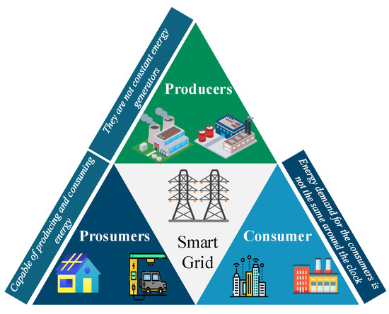 Electricity is generated from various sources, such as thermal power plants, nuclear power plants, hydropower plants, and other RES, which include solar parks and wind parks [27]. The sources of energy generators are termed “producers”. In the present electric grid system, the generated electricity is consumed by the group called consumers, including actors such as industries, factories, and homes/societies. The electric grid can accommodate these two actors in the system structure, and the flow of electricity is unidirectional.