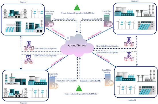 FL techniques work by training a model collaboratively among distributed devices without the need to share the data to a centralized server. Data privacy can be ensured in SG with the help of FL mechanisms. Figure 3 depicts the FL-based incentive mechanism for SG. Training the data is carried out locally in the respective stations, and the result will only be shared with the cloud server. The parameters thus obtained can be used for global model updates. Appropriate incentives will be provided to the consumers based on the data obtained in the cloud server. A mechanism for privacy-preserving energy data sharing using edge-cloud collaboration was proposed by [78].