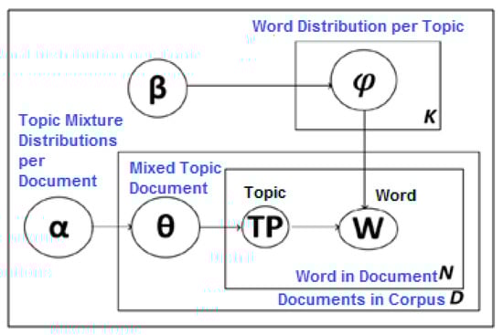 Figure 2 provides a graphical representation of LDA topic modeling. The Latent Dirichlet Allocation (LDA) model, proposed by Blei et al. [68], is an unsupervised method that is well-known in text mining applications. It can recognize the latent topics from several documents automatically [26]. LDA is used to arrange a document text into specified topics. It generates topics per documents model and words per topic model, using Dirichlet distributions [69]. Each topic is a collection of keywords, and each keyword participates in a specific weightage to the topic [68]. Variables and parameters which appear in Figure 2 of the LDA model are interpreted as: D is the number of documents in the corpus, N is the number of words in a specified document, A is the Dirichlet prior parameter on the topic distributions per document, Β is the Dirichlet prior parameter on the word distribution per topic, Θ is the topic distribution for a specified document, Φ is the word distribution for a specified topic k, TP is the topic assignment for a word in the specified document, and W is the specified word.