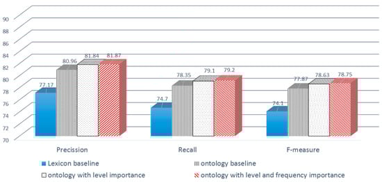 We benefit from these studies to build an enhanced approach for ASA using the ontology model. Tartir and Abdul-Nabi [29] focused on the semantic relations between sentiments and their instances to present a semantic orientation approach. In other semantic orientation approaches such as the studies of Thakor and Sasi [19,20,21,22,23,24], they focused on the use of ontology for feature identification and extraction without considering any other information from the ontology tree such as the levels of features, while El-Halees and Al-Asmar [25] used the levels of features to calculate the polarity, by multiplying each feature level with its sentiment polarity, where the levels indicate the feature importance. In this research, we used the ontology to identify and extract the domain features and their levels, while at the same time the frequencies of these features in the review’s dataset are also used to identify the importance of each feature.