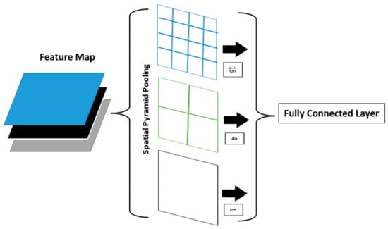 SPP [38] has multiple advantages. Firstly, SPP is able to provide an adequate fixed-length output independent of the input dimensions [47,48]. Additionally, SPP makes use of multilevel spatial bins, whereas sliding window pooling only makes use of a single window size, in contrast to SPP’s usage of several window sizes [49]. For the purposes of this experiment, an SPP block layer was added to the configuration files for Densenet, Resnet 50, Yolo V4, and Yolo V5. Using the same SPP block layers in the configuration file, we could also create spatial models using them. The spatial model takes advantage of downsampling in convolutional layers to get the required properties in the max-pooling layers, which are subsequently used to construct the model. Three different sizes of the max pool were applied for each image using [route]. Different layers (−2, −4, −1, −3, −5, and −6) in were used in each [route]. Figure 1 illustrates the SPP architecture.