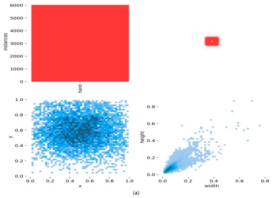 Figure 4 shows a sample image of Oxford hand dataset. Furthermore, Figure 5 describes the label and correlogram of the Oxford hand dataset. Yolo V5 generates correlogram plots to display the features of the supplied image and bounding box. As we can see in Figure 5a, our experiment only has one class: “hand”. Furthermore, the hand images contain nearly 6000 instances, with x, y varying from 0.0 to 1.0, and height, weight varying from 0.0 to 0.8, as can be seen in Figure 5b.