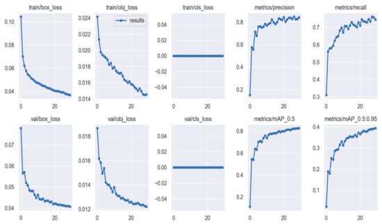Moreover, Figure 7 exhibits the training and validation performance with Yolo V5. In our experiment, we trained Yolo V5 with 30 epochs that were completed in 6615 h. Some hyperparameters in the Yolo V5 configuration file were as follows: iou_t = 0.2, anchor_t = 4.0, fl_gamma = 0.0, hsv_h = 0.015, hsv_s = 0.7, hsv_v = 0.4, degrees = 0.0, translate = 0.1, scale = 0.5, shear = 0.0, perspective = 0.0, flipud = 0.0, fliplr = 0.5, mosaic = 1.0, mixup = 0.0, copy_paste = 0.0, lr0 = 0.01, lrf = 0.01, momentum = 0.937, weight_decay = 0.0005, warmup_epochs = 3.0, warmup_momentum = 0.8, warmup_bias_lr = 0.1, box = 0.05, cls = 0.5, cls_pw = 1.0, obj = 1.0, and obj_pw = 1.0. The Yolo loss function is expressed below [52,53].