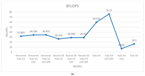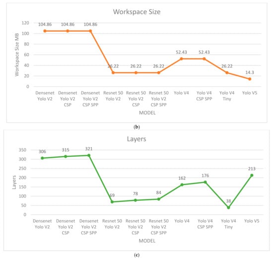The BFLOPS, workspace size, and layer for each CNN model in this study are illustrated in Figure 10, providing a comparison of the three variables. Yolo V4 CSP SPP achieved an optimal BFLOPS of 76.2, whereas Yolo V4 Tiny presented the minimum of 6878 BFLOPS (Figure 10a). The Densenet model required the largest workspace size of 104.86 MB (Figure 10b). Furthermore, Yolo V5 required the smallest workspace size of ~14.3 MB, Resnet 50 required 26.22 MB, and Yolo V4 required 52.43 MB. The combination of CSP and SPP layers increased the size of te original model. Densenet Yolo V2 CSP SPP contained 321 layers, Resnet 50 Yolo V2 CSP SPP contained 84 layers, and Yolo V4 CSP SPP contained 176 layers according to the weight file (Figure 10c).