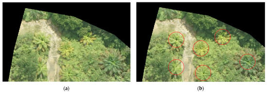 Yin et al. [5] stated that drone remote sensing is cheaper and more flexible than satellite imagery on an industrial scale. The rapid development of drone technology, information technology, and sensor technology allows drones to also be applied to various fields of agriculture and forestry. Drone remote sensing technology can monitor large areas of plantations with high spatial resolution, so it is widely used for oil palm research such as tree counting [6,7,8], oil palm harvest prediction [9], plant nutrition monitoring [10], and plant health monitoring [11].