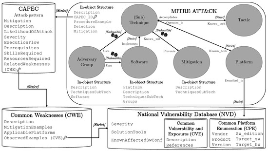The supporting datasets provide information on attack patterns (Common Attack Pattern Enumeration and Classification—CAPEC), software and hardware weakness types (Common Weakness Enumeration—CWE), and the National Vulnerability Database (NVD). The latter is a rich repository of data; here, we distinguish two subsets including data about vulnerabilities (Common Vulnerabitlities and Exposures—CVE) and platforms (Common Platform Enumeration—CPE).