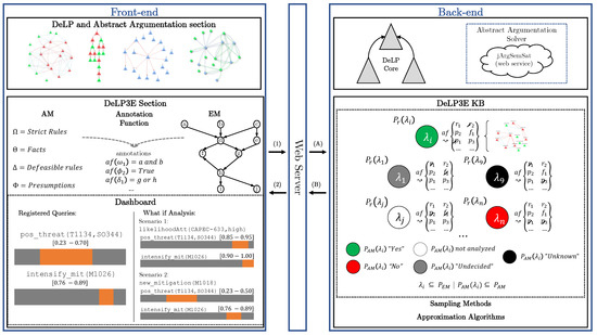Figure 3 shows an overview of the tool’s architecture and workflow that is a mock-up of a possible user interface that we are currently developing. The architecture is divided into two main modules, the front end and the back end. Within the former, there are two main sections: the DeLP and abstract argumentation section manages classical (nonprobabilistic) models and is described in detail in [19]; we focus on the DeLP3E section, which is the extension presented here. The back end is organized analogously, with the addition of three other submodules that implement the probability model (for the EM), sampling methods, and approximation algorithms.